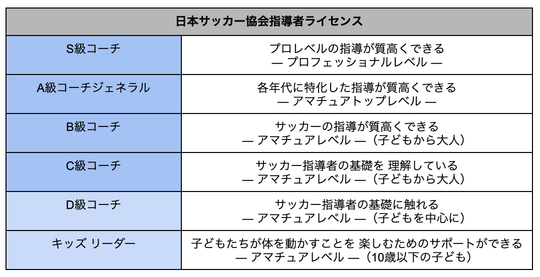 ライセンス取得は就職において重要な条件となります。「日本サッカー協会指導者ライセンス」の種類は以下の通りです。